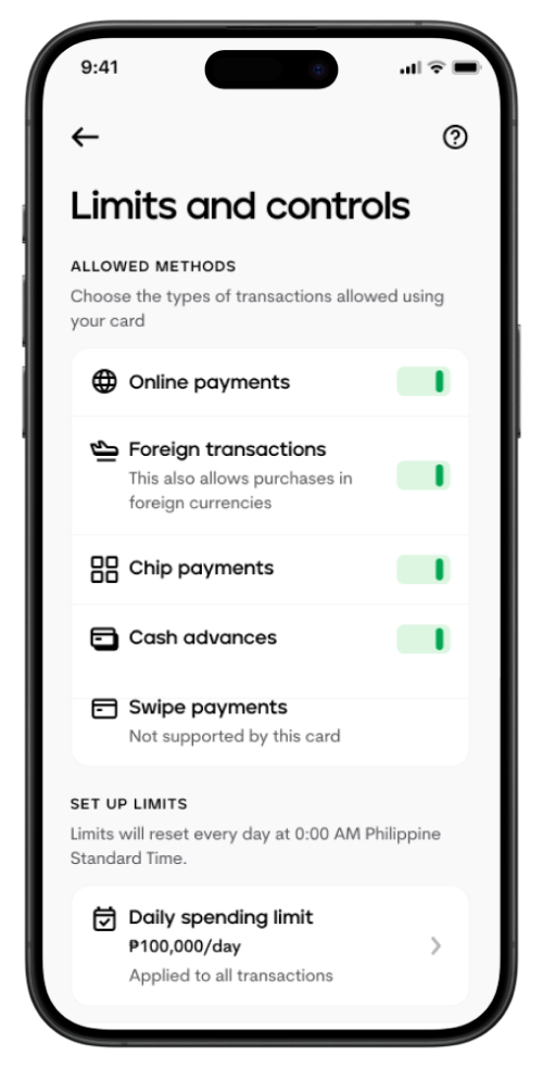 Get ultimate control on your credit card with customizable spending limits for various transactions or simply turn it on and off