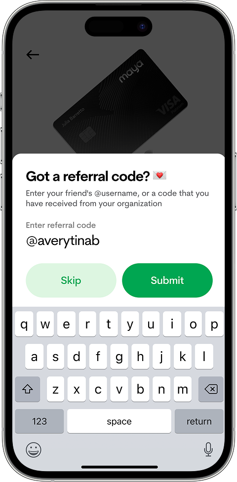Enter your friend’s referral code to earn Maya Miles upon approval