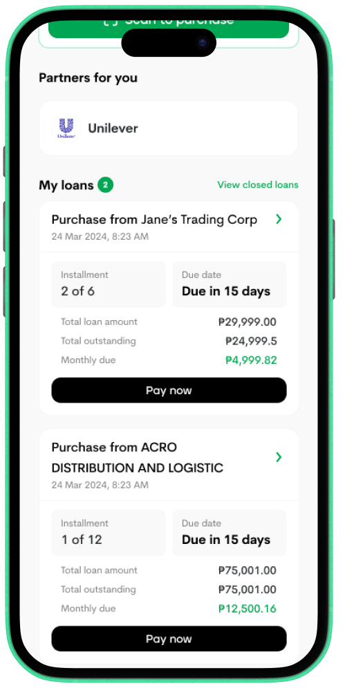 Accept your Suki Credit offer. Now you can start using your Suki Credit to pay your partner supplier.